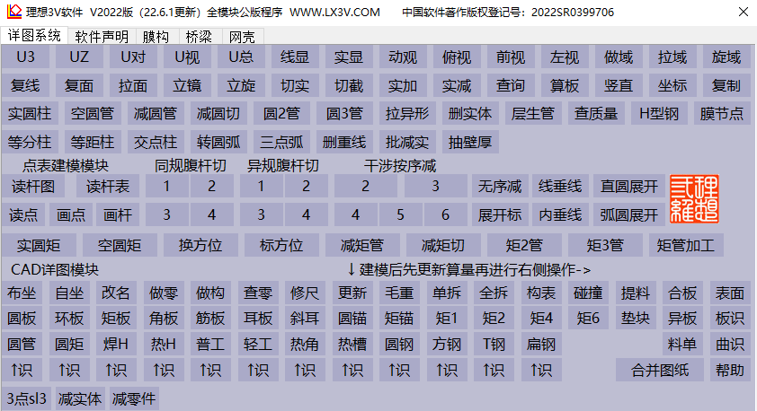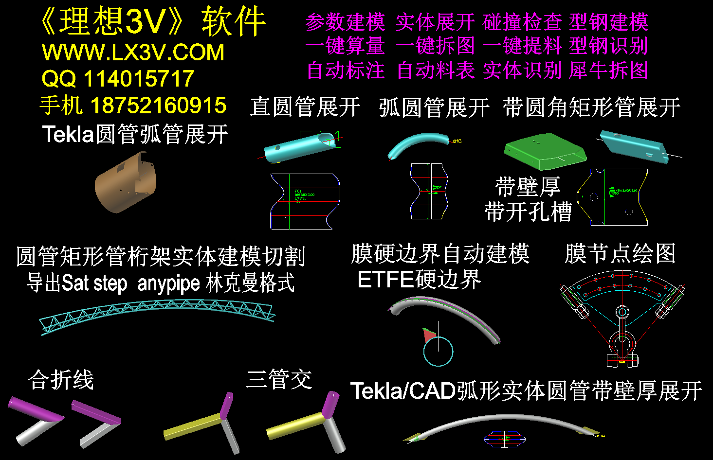 1.包括CAD模型的直圆管展开,弧形圆管展开。硬边界建模,膜节点绘图。圆管,矩形管桁架自动建模切割。圆管矩形管,两管交三管交自动建模。