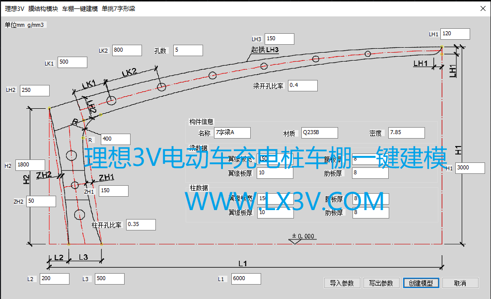 6.电动汽车充电桩车棚,7字车棚软硬边建模,拉杆工字梁车棚自动建模,双挑工字梁车棚建模等6种常见车棚建模。