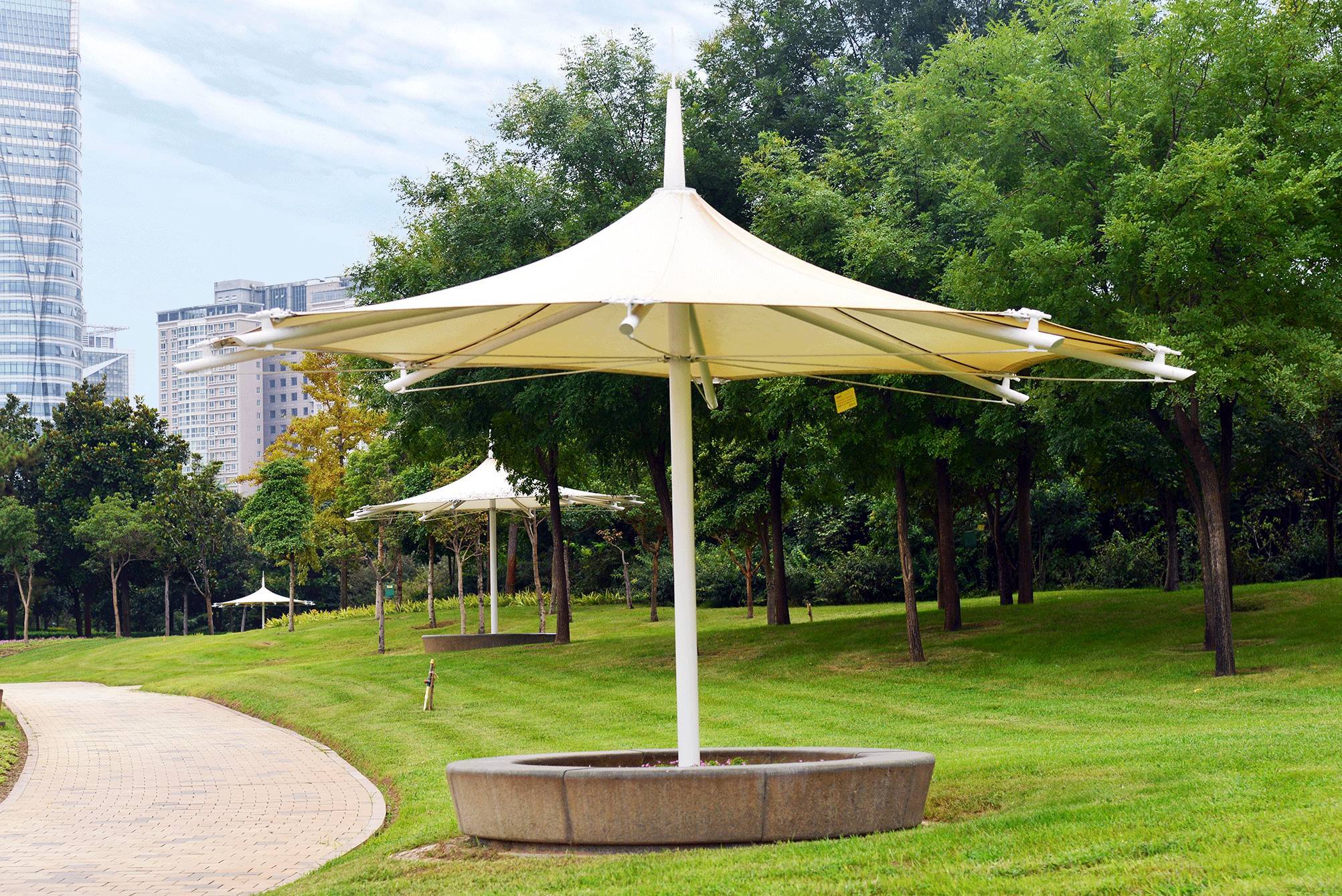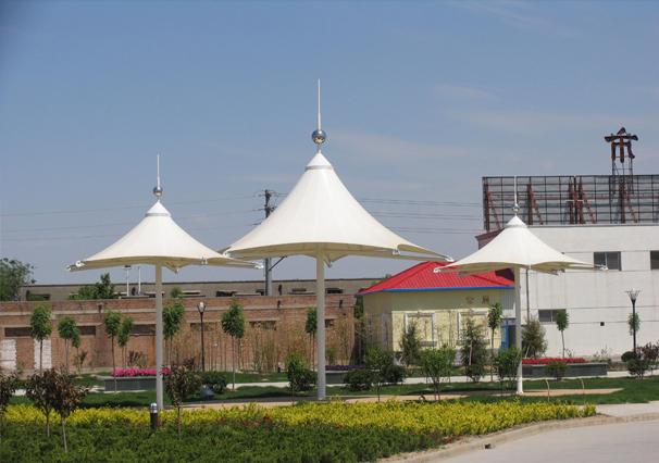 膜结构景观遮阳伞常用于十字路口,分流岛,景区景观,小区公园休闲,夏天炎热,在公园小区庭院安装一款遮阳的遮阳伞是非常合适的。